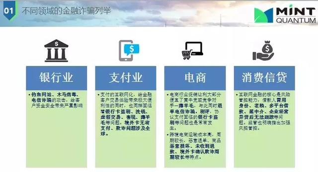 接下來介紹下不同領(lǐng)域的金融欺詐類型,如銀行業(yè)釣魚網(wǎng)站,木馬病毒,做一個(gè)假的網(wǎng)站;電商行業(yè)促銷讓利大部分便宜了黃牛黨或競爭對手—薅羊毛,與此同時(shí)退單電信詐騙,刷評(píng),協(xié)議支付面臨的銀行卡盜刷等問題也是常有發(fā)生;消費(fèi)信貸中借款人冒用身份、老賴、多平臺(tái)借款、黑中介、企業(yè)經(jīng)營異常貸后無法跟蹤等問題。