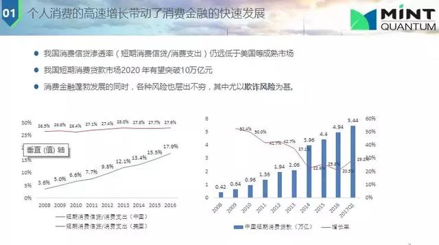 美國是個(gè)人消費(fèi)實(shí)力很強(qiáng)的一個(gè)國家,我們以它為標(biāo)桿。圖中藍(lán)線代表中國,紅線代表美國。預(yù)測中國短期個(gè)人貸款到2020年達(dá)10萬億元,可見市場龐大。個(gè)人消費(fèi)不僅僅靠大銀行,還要靠其他小型機(jī)構(gòu);因?yàn)榇筱y行本身這種特點(diǎn)(客群優(yōu)質(zhì)),很難下放到下層服務(wù)。在信用風(fēng)險(xiǎn)中欺詐風(fēng)險(xiǎn)在我國占的比例非常高,數(shù)額也比較大,經(jīng)常是有組織的欺詐,如做“網(wǎng)絡(luò)黑產(chǎn)”有百萬級(jí)人員,市場規(guī)模為千億級(jí),很多公司被迫無法經(jīng)營,據(jù)估計(jì),互聯(lián)網(wǎng)金融一半以上的壞賬風(fēng)險(xiǎn)來自欺詐風(fēng)險(xiǎn)。對比美國這方面比例就相對小的很多,如一個(gè)千億級(jí)個(gè)人消費(fèi),中能達(dá)20-30億美元,美國則只有幾千萬美元。原因有一點(diǎn)是美國征信做的比較好,幾乎覆蓋所有成年人。反欺詐就是提高欺詐的成本。