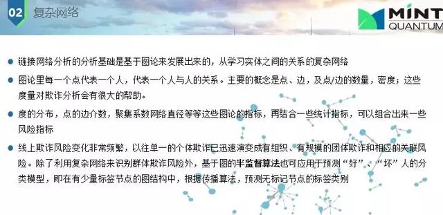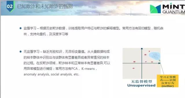 下面是欺詐與未知欺詐甄別問題,主要是監(jiān)督學(xué)習(xí)和非監(jiān)督學(xué)習(xí)。監(jiān)督學(xué)習(xí)是知道一個(gè)人以前欺詐(父母信息不對,電話號(hào)碼有誤等),我們就會(huì)打上標(biāo)簽,歷史數(shù)據(jù)就會(huì)訓(xùn)練我們的模型,統(tǒng)計(jì)模型所用數(shù)據(jù)大都都是有標(biāo)簽的;非監(jiān)督學(xué)習(xí)也是經(jīng)常使用的,因?yàn)槠墼p是經(jīng)常改變的或不同特征的,我并不知道他是否是欺詐,我們用關(guān)聯(lián)網(wǎng)絡(luò),每個(gè)人間有聯(lián)系,這種網(wǎng)絡(luò)快速發(fā)展;還有一種是兩者結(jié)合起來,利用權(quán)重評(píng)估。