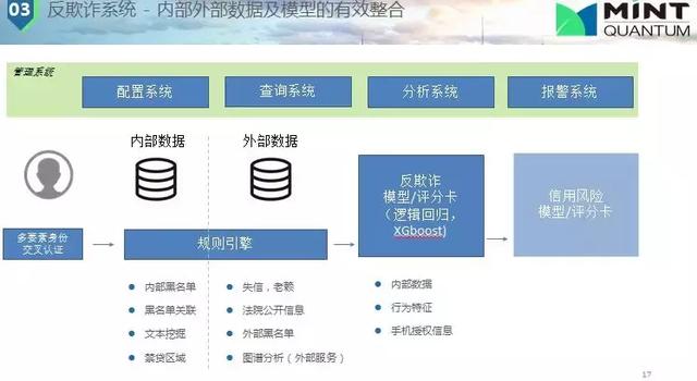 接下來講一下我們線上的一個(gè)反欺詐系統(tǒng)框架,下圖簡化了實(shí)際反欺詐系統(tǒng)。介紹了基本流程,首先是身份的交叉驗(yàn)證,證明你是你。不光是銀行卡、手機(jī)、身份證交叉認(rèn)證,還有你的照片、活體認(rèn)證(你在上面動(dòng)來動(dòng)去);內(nèi)部數(shù)據(jù)和外部數(shù)據(jù)有一個(gè)決策引擎,這里面存儲(chǔ)了各種規(guī)則;接下就是一個(gè)評(píng)分分析系統(tǒng),這些數(shù)據(jù)有手機(jī)的行為數(shù)據(jù)也有其他外部數(shù)據(jù)(不可控,最好有個(gè)穩(wěn)定模型進(jìn)行備份);除此之外還有個(gè)預(yù)警系統(tǒng),對我們的模型進(jìn)行監(jiān)管,需要對實(shí)時(shí)數(shù)據(jù)進(jìn)行一些評(píng)估,這一點(diǎn)也是非常重要的。