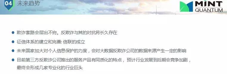 對未來一點(diǎn)展望,欺詐永遠(yuǎn)不會(huì)停止、不會(huì)消失,尤其在中國征信沒有完全建立,人口多,社會(huì)缺乏金融知識(shí),對征信了解很少,收入差距比較大的環(huán)境下,欺詐現(xiàn)象會(huì)長期存在,這在風(fēng)控里面是考慮的一個(gè)重要部分。征信體系的建立和完善,雖然這個(gè)過程會(huì)很長;目前第三方反欺詐公司推出的服務(wù)產(chǎn)品有同質(zhì)化的特點(diǎn),預(yù)計(jì)行業(yè)發(fā)展到后期會(huì)競爭加劇,最終會(huì)形成幾家專業(yè)化的行業(yè)巨頭。(文字來源:今日頭條)